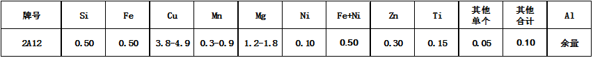 產品介紹 2A12-H112鋁合金為一種高強度硬鋁,可以進行熱處理強化;2A12鋁合金點焊焊接性良好,用氣焊和氬弧焊時有形成晶間裂紋的傾向;2A12鋁合金在冷作硬化后可切削性能尚好。抗蝕性不高,常采用陽極氧化處理與涂漆方法或表面加包鋁層以提高抗腐蝕能力。 化學成分 產品特性